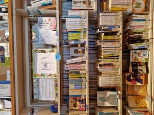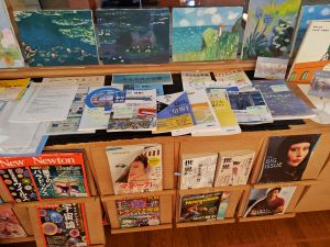 入口すぐのコーナーには、雑誌・新聞のほかに、礼拝で紹介された資料やりんごの本棚、シャンティ国際ボランティア会の「絵本を届ける運動」の展示も。展示を見ていると自然とダイバーシティや国際協力への理解が自然と深まります。
