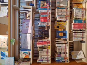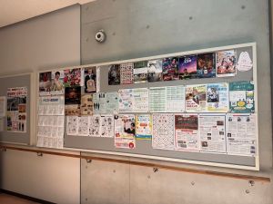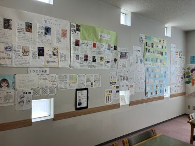 新書コーナーの反対側には、歴代の図書委員会展示が掲示されています。新書の部屋の余韻に浸りつつ、図書館入口へ戻ります。