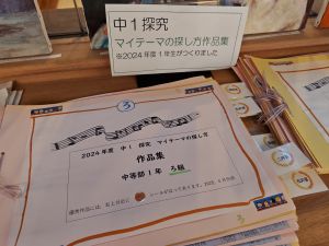 ○中1探究「マイテーマの探し方」生徒の成果物探究活動の入門として、中学1年生が実践している清教学園 片岡則夫先生提唱の「画用紙1枚のミニ調べる学習」の成果物をクラスごとに綴じて展示。