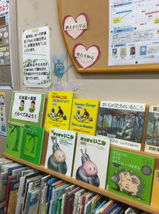 まずは3階の中学校図書館へ。図書委員さんが受付と案内をしてくれました。絵本コーナーでは、日本語×英語の読み比べができます。
