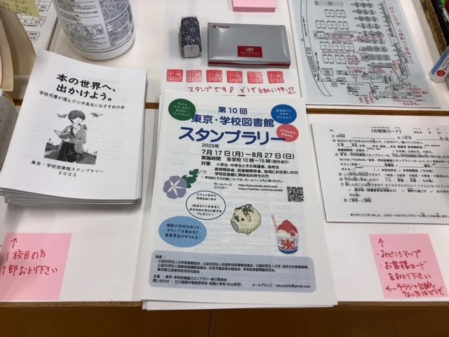 正面玄関から3階へと昇る階段に、スタンプラリーの案内ポスターがありました。生徒さんのイラストです。