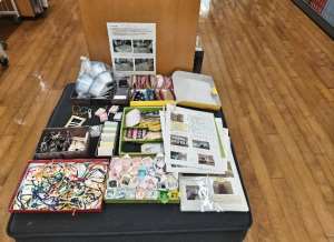 図書館関係者の方が来校 1校目とのことで冊子をプレゼント。展示物を楽しまれたそうです。