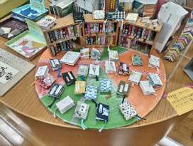 展示物ではなかまちテラスとの共同おすすめ本、スタンプラリーの紹介、ガラスに透ける切り絵などがありました。