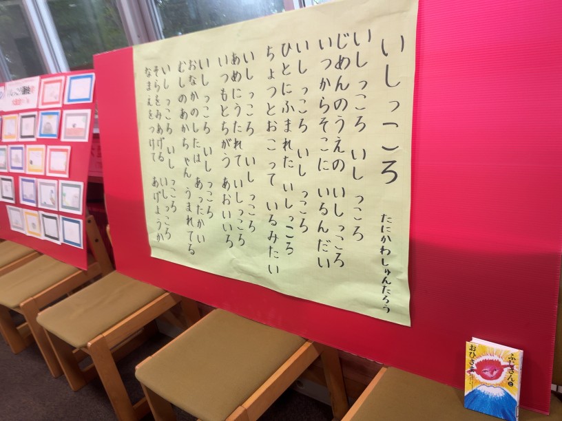続いて“詩のアニマシオン”の体験をしました。詩は谷川俊太郎の「いしっころ」。耳で聴いたその詩の世界のイメージを、小さなイラストにしてみよう、というアニマシオン。ゆったり、やさしい、あたたかく朗読してくれました。比較的最近の新書を、塔にして積み上げられています。この塔に置かれた新書の本は、書架に差し込まれた新書よりも動きが良くなるそうです。