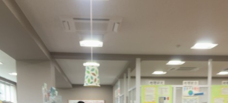 視線をあげて天井を見上げると、長い糸がカウンターから図書館中央までつながれています。