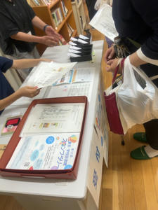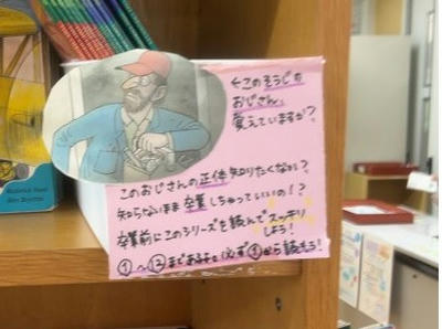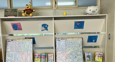 展示のコーナーは多数設置されていて、それぞれのコーナーをどんな風に楽しんで読んだかお話しながら館内や書架内の随所に小さな手作りが添えられていました。