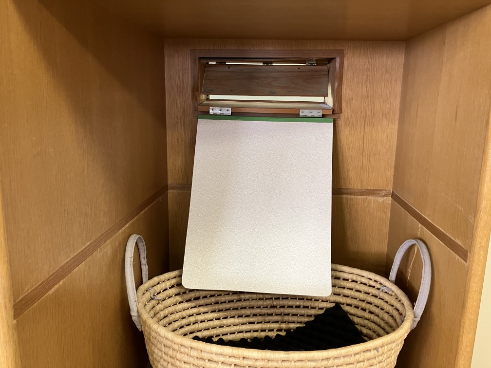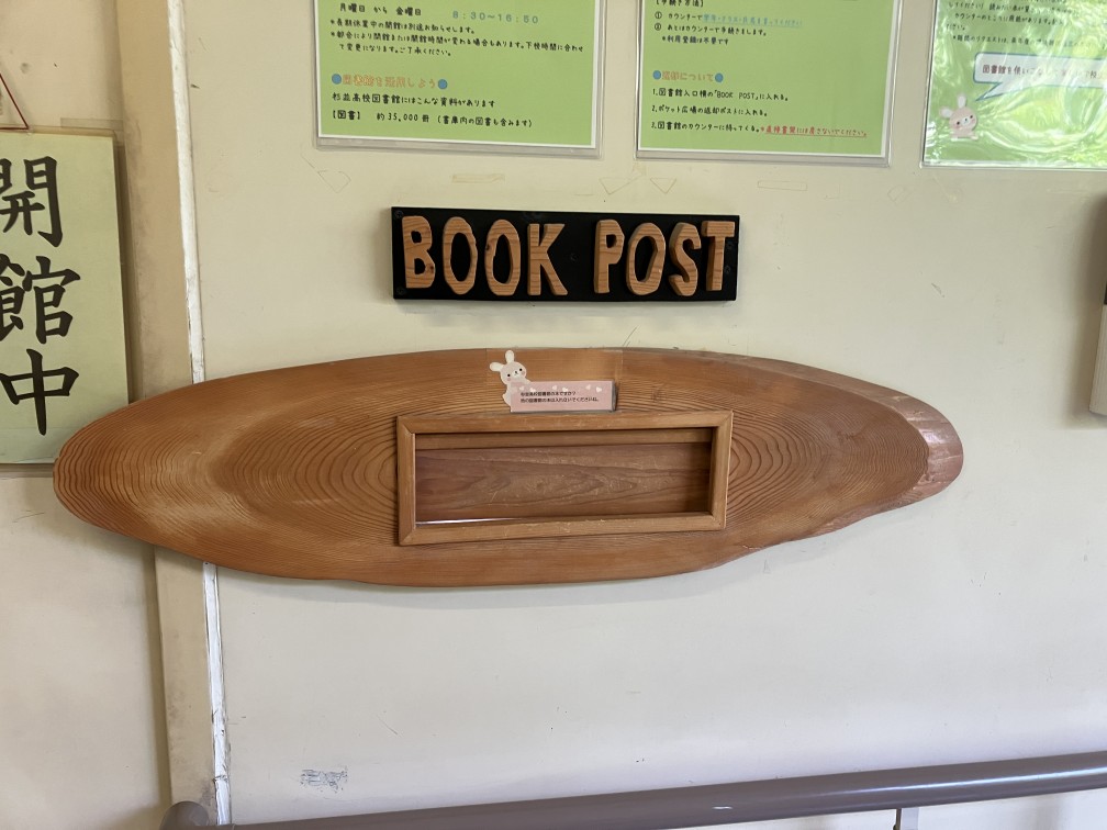 その手前、このバスケットには何が?なんと図書館の扉の外のブックポストに入れられた本は、ここでキャッチされるのです。本に優しいあたたかなつくり。 -