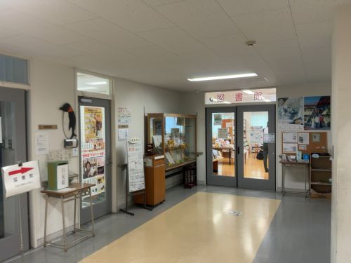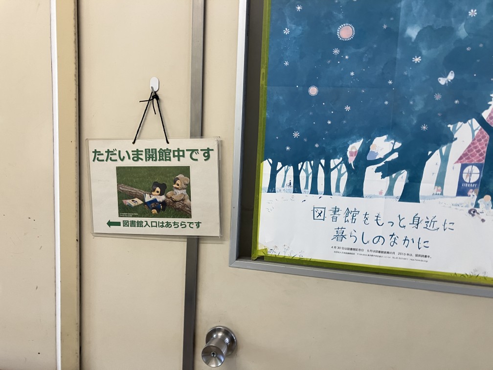 図書館は2階です。廊下には映画のポスターや同窓生の記事など、さまざまな掲示がありました。