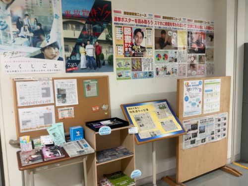 古い新聞ラックをリサイクルして作られた、選挙の特集展示コーナー。