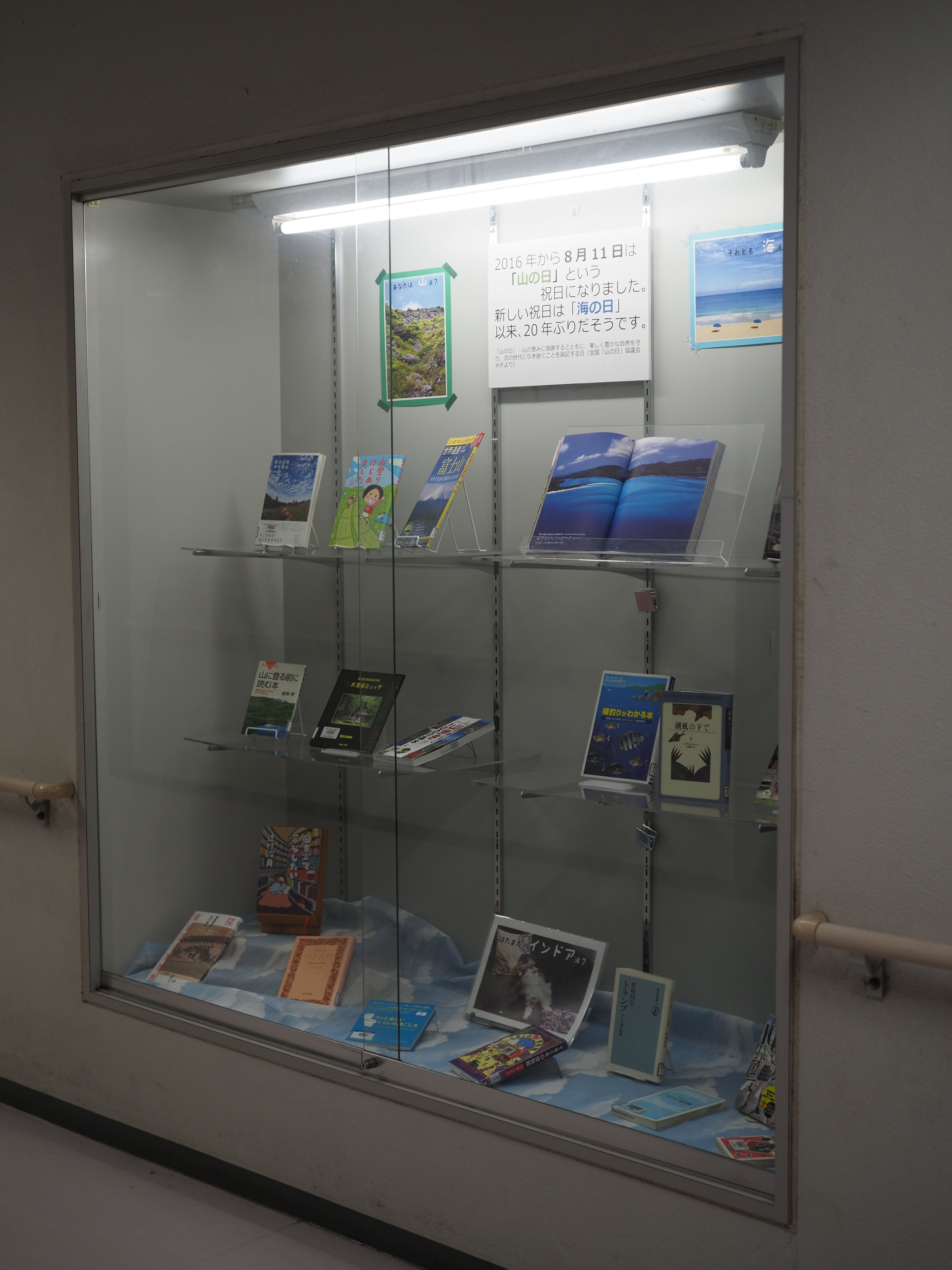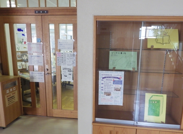 入口のガラスケースには、生徒たちの作った本紹介のPOPが展示されていました。
