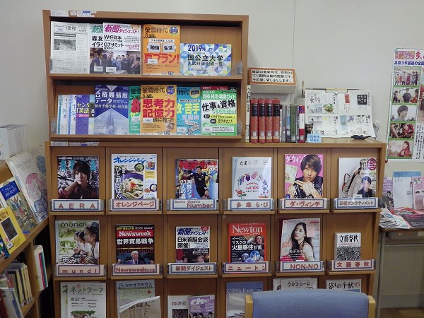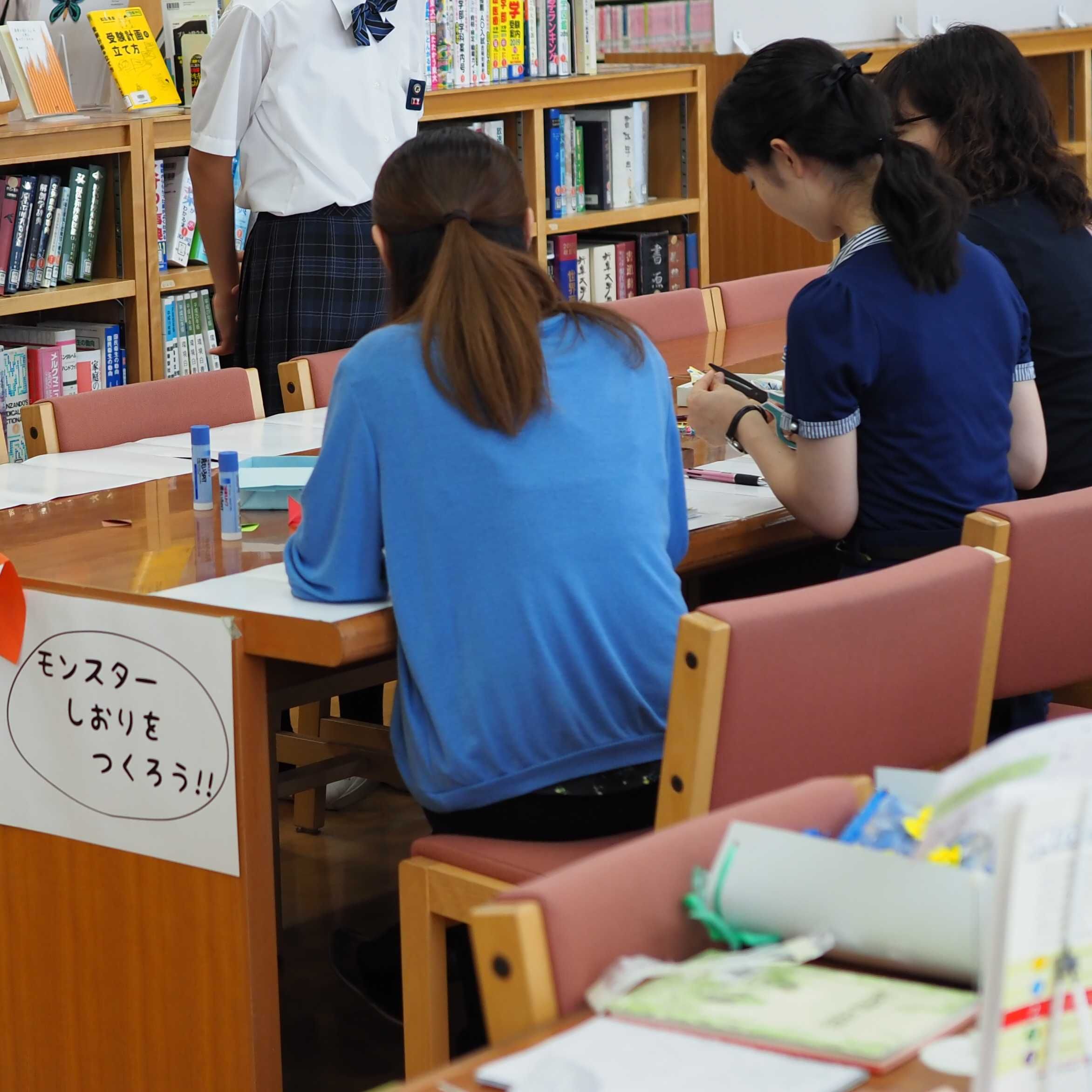 8月9日(木)、相変わらず酷暑の中、都立武蔵高等学校・附属中学校にお邪魔しました。二階に上がって、出入り口には展示スペースが。海の日にちなんだ水色の本が涼風を連想させちょっとだけ気持ちが涼みました。入口正面は、雑誌と漫画コーナーです。(図書館全景写真はちょっと失敗してしまい、部分ばかりですみません……)この日は、モンスターしおり作りをしていました。本を食べるモンスター??図書委員さんたちが丁寧に教えてくれました。また本の表紙を利用したメモ帳作りも。こちらも図書委員さんによる指導です。表紙の一部分を活用してつくります。模様の切り取り方でまた楽しいメモ帳になりました。その他、館内には、英語の授業や図書委員によるPOPとその図書などが展示されていました。