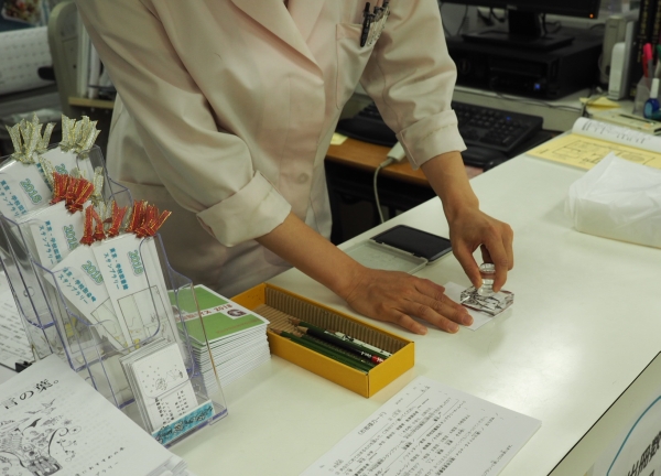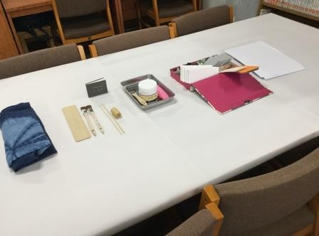 好きな言葉をしおりに印刷してもらえます。準備をしてくれているところ。右下に見えるのが活字。普通の水彩絵の具をつかいます。