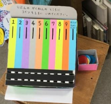 入口には来館者をカウントするための、たのしい仕組みが。自分の学年のところに、右にあるコインを入れるのだそうです。
