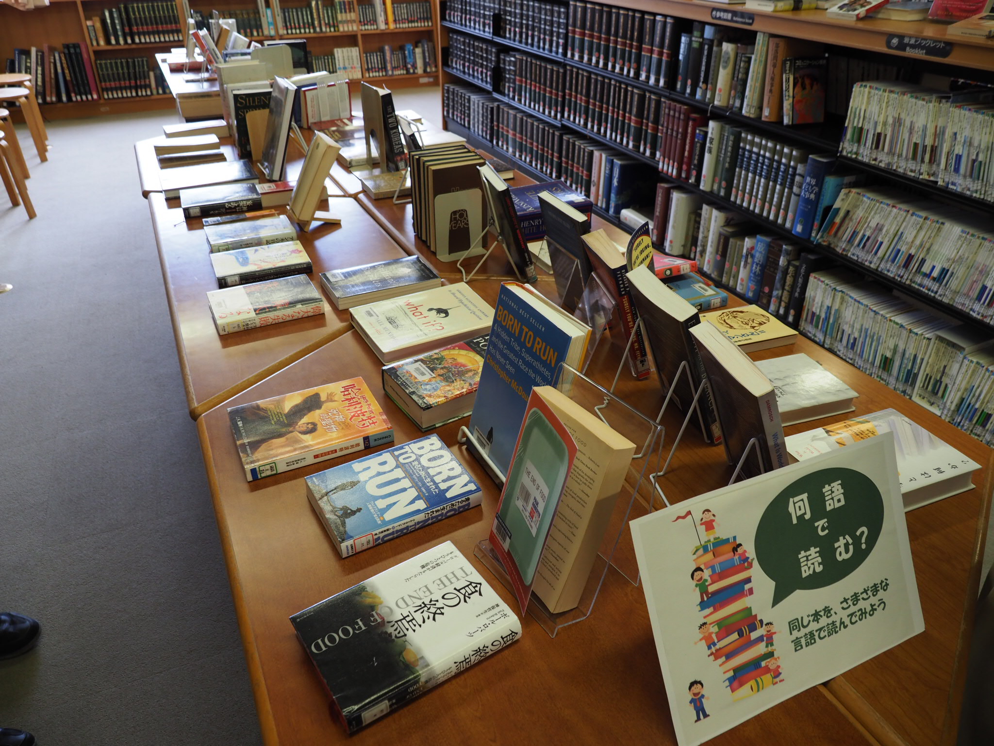 同じ作品のいろいろな言語の書籍が並べられて展示されてました。 多くの図書館では日本語図書と外国語図書は別々に配架されているのが一般的ですが、全ての言語の図書がいっしょに並べられているのもこの図書室の特徴の一つ。