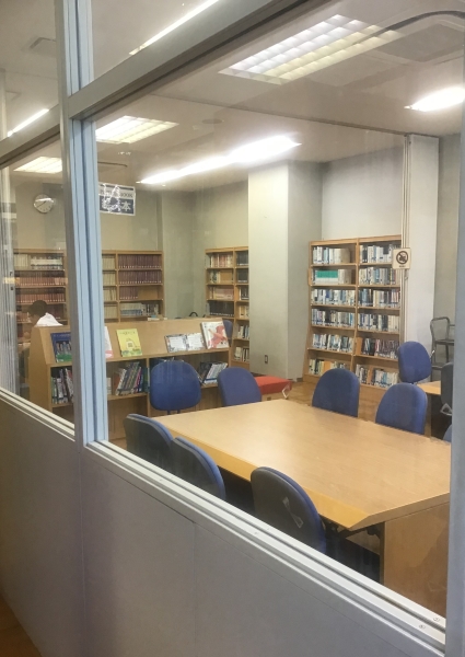 カーテンが開いている部屋が図書館。