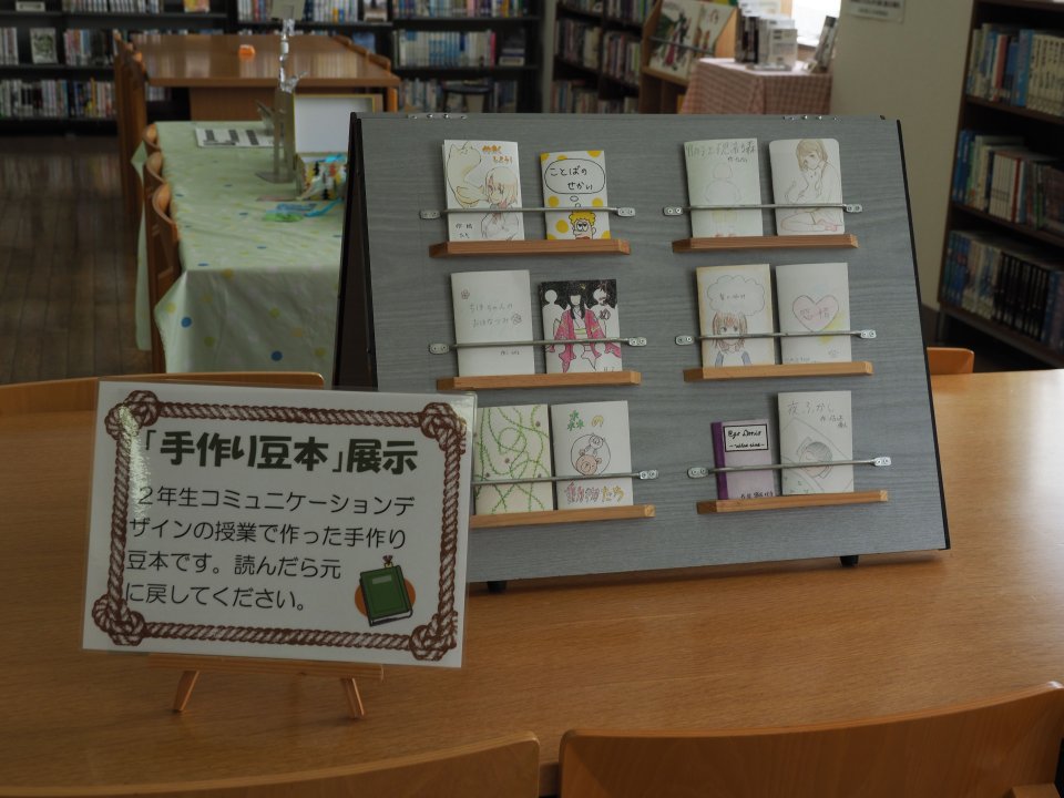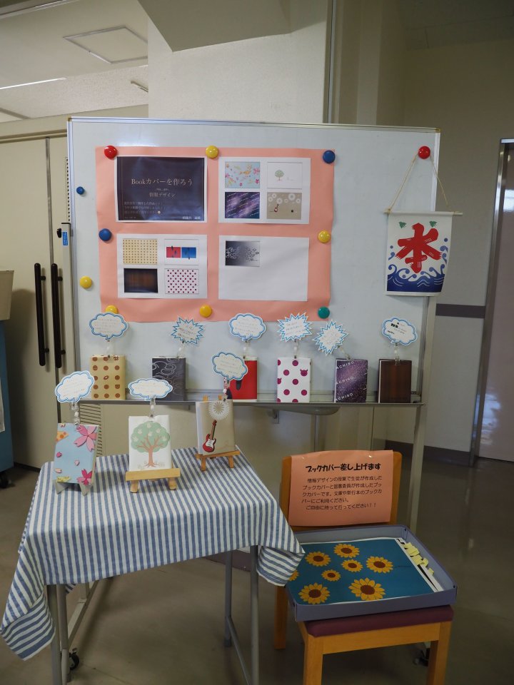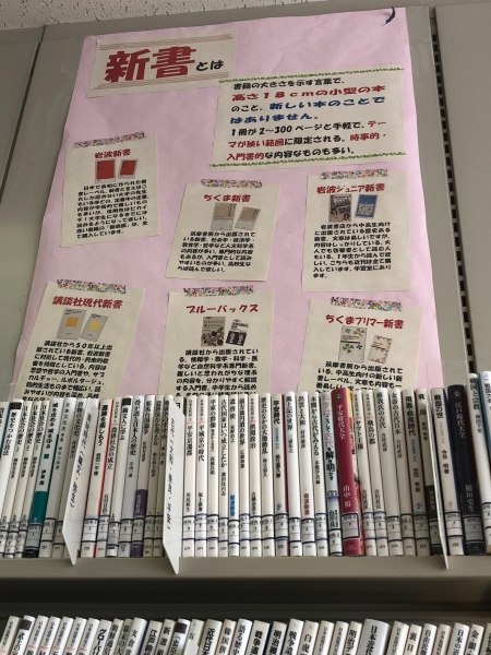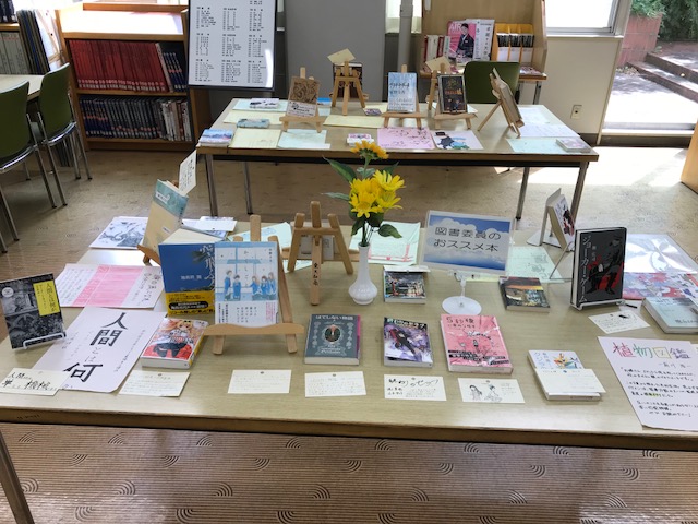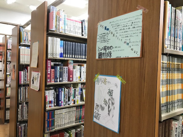 入口のガラスケースには、生徒たちの作った本紹介のPOPが展示されていました。