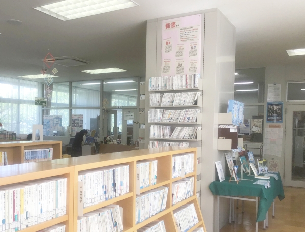 新着図書の本棚の前で