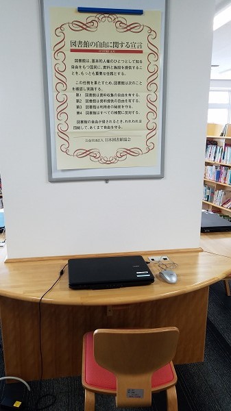 「図書館の自由に関する宣言」は利用者の目につきやすい真正面に貼られていました。
