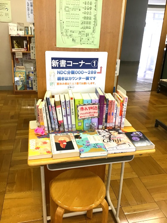 「源氏物語」コーナー(このコーナーの横の棚が新書棚)