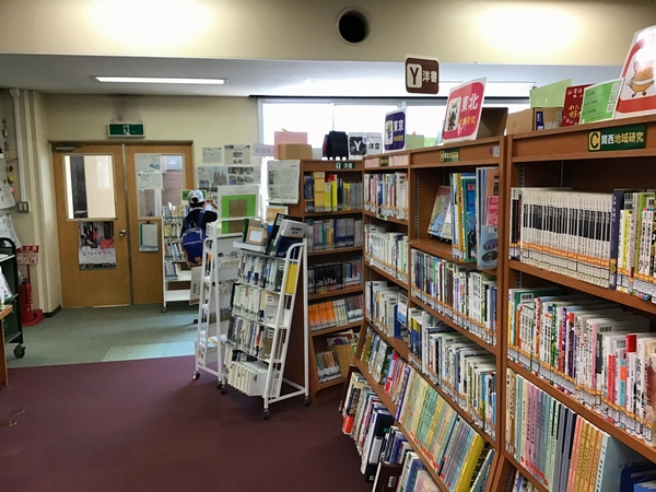 入ってすぐに新着コーナー、左手に雑誌・漫画・インターネット利用スペース。右手に新書の棚。必要かつキャッチーな資料を前面に配置してるんですね。