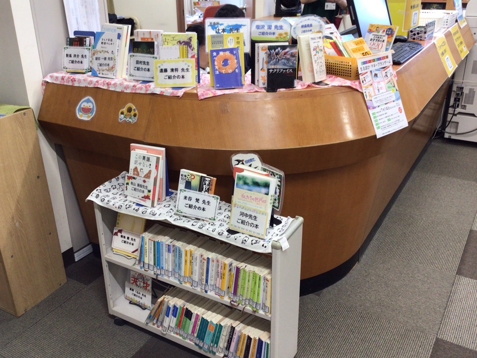 カウンターに並ぶ先生方の紹介本 校長先生の著書『できちゃいました! フツーの学校』も展示されています。 |