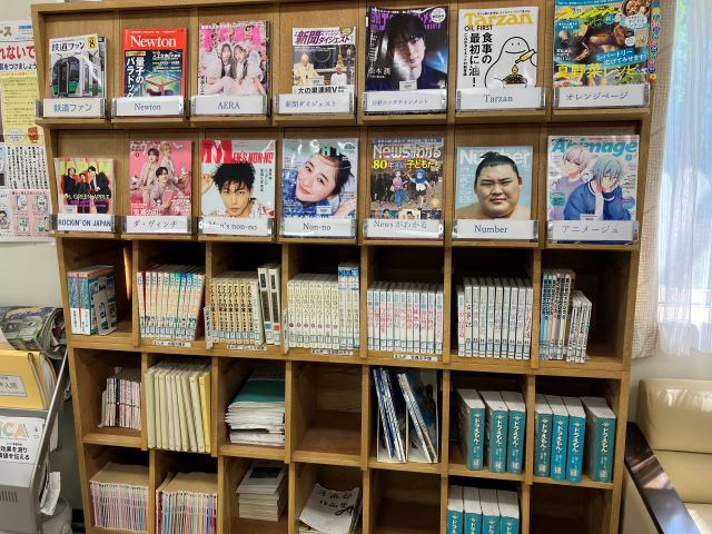 雑誌の隣の新聞ラックに、読解の特訓に便利な「天声人語」がファイリングされています。
