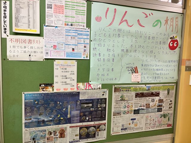 入口の前には「リンゴの棚」の紹介とともに、リーディングトラッカーを自由に使えるように置いてくれています。疲れ目の時、調べもの図書の内容がいまいち頭に入ってこないときに使うとよいですよね。