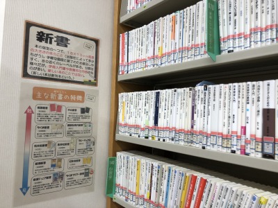 新書の書架横には丁寧な説明が。手に取ってみたくなる仕掛けがあちこちにあります。