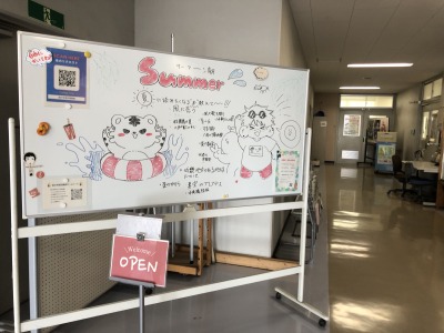 階段を上がると見えてくるホワイトボードには、夏らしいポップなイラストが!