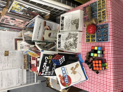 ルービックキューブや知恵の輪、けん玉が自由に手に取れるコーナー。