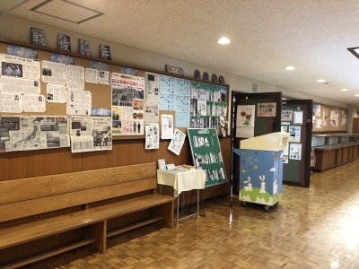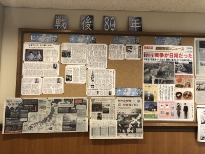 館外には「戦後80年」と題して「ヒロシマ」「ナガサキ」「オキナワ」「終戦記念日」「記憶の継承」に関連した新聞記事やポスターが掲示されていました。