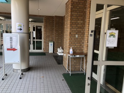 入口の横には大きな掲示板とベンチ、返却ポストがあります。