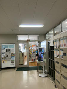 図書館の入口には、掲示板やデジタル案内パネルが設置されていました。